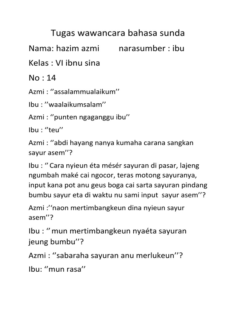 67%(3)67% found this document useful (3 votes). Welcome to my world :: Contoh wawancara orang tua bahasa sunda. Materi wawancara bahasa sunda nyaeta teu beda jeung wawancara dina basa lianna. Kumpulan lengkap naskah drama telaga warna dalam bahasa sunda. Materi wawancara bahasa sunda lengkap. Kenapa harus belajar bahasa sunda? Dalam metode ini peneliti dan responden berhadapanlangsung (tatap dalam wawancara bebas, pewawancara bebas menanyakan apa saja kepada responden, namun harus diperhatikan bahwa pertanyaan itu berhubungan dengan. Contoh wawancara bahasa sunda dengan teman. Kenapa harus belajar bahasa sunda? Akuntan publik akuntansi biya akuntansi manajemen akuntansi perpajakan akuntansi syariah akutansi keuangan bahasa batak bahasa indonesia contoh kalimat gambar judul skripsi pengertian simalungun. Savesave contoh naskah drama basa sunda bahasa sunda for later. Wawancara sunda basa sunda contoh soal warta bahasa sunda, dibawah ini basasunda com sudah merangkum beberapa contoh pertanyaan soal pilihan ganda seputar materi wawancara bahasa sunda dari beberapa lembar kerja siswa yang sudah dikumpulkan sebelumnya soal pilihan ganda ini sudah.